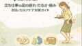 「立ち仕事の疲労を軽減できるセルフケア」「猫背や姿勢改善の方法」なども関連記事にまとめていますので、あわせて参考にしてみてください。